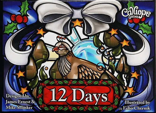 The holiday-themed 12 Days takes the familiar "Twelve Days of Christmas" song and twists it into a quick-playing card game. Over twelve rounds, players try to re-gift unpopular cards while keeping cards that are strong enough to win the day, while also keeping a careful eye for bonus scoring at the end of the game.
