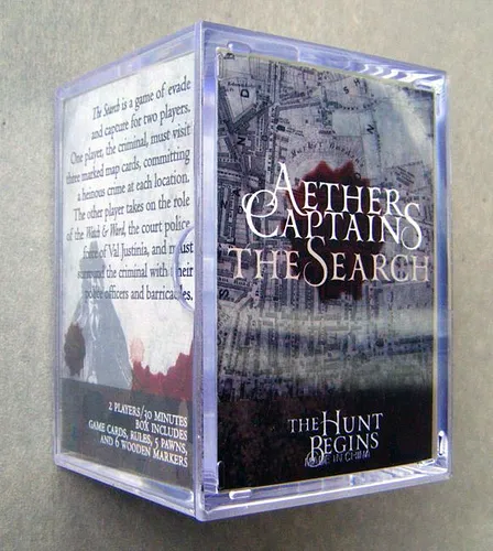 The Search is a game of evade and capture for two players taking place in the Aether Captains world of Arkady. One player, the criminal, must visit three marked map cards committing a heinous crime at each location. The other player takes on the role of the Watch & Ward, the court police force of Val Justinia, and must surround the criminal with their police officers and barricades.