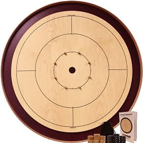 Crokinole is a fun dexterity game for two to four players, played on a circular wooden board. The board features three scoring rings and a central bullseye. Players take turns flicking wooden disks across the board, aiming to land their disks in the highest scoring areas. The center hole is worth 20 points, while the outer rings score 5, 10, and 15 points. A ring of posts surrounds the inner circle, adding a challenge as players try to navigate around them.