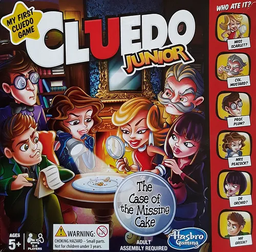 In Cluedo Junior, young detectives work together to solve a sweet mystery. Players must figure out who ate the cake, what time it happened, and what drink was enjoyed alongside it.
