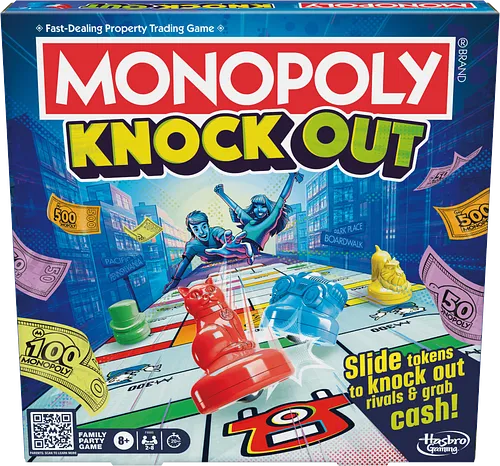 Compete in Monopoly Knockout by sliding your tokens down a long game board, aiming to land on properties. You can play alone or in teams, taking turns to see who can earn the most cash. Watch out for opponents who might try to knock you off your target!