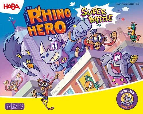 Rhino Hero is back, and this time it's all about climbing a tall, wobbly skyscraper while battling against friends! Players take on the roles of four superheroes: Rhino Hero, Giraffe Boy, Big E., and Batguin. As you stack cards to build the tower, you'll also engage in playful battles, trying to outsmart each other while avoiding pesky spider monkeys hanging around.