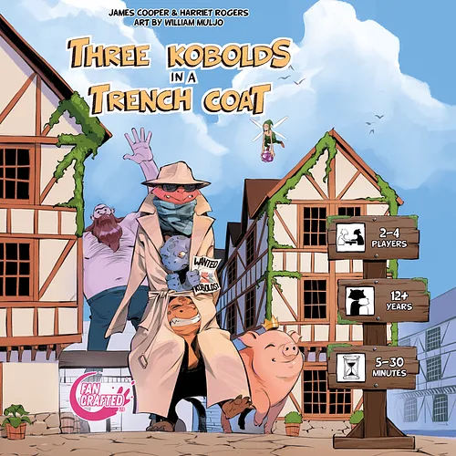 Three Kobolds in a Trench Coat is a fun bluffing game for 2-4 players. In this lively adventure, the Kobolds are eager to explore the village of Crumblebatch, but they need to disguise themselves as regular villagers to avoid trouble. They come up with a clever plan to stack themselves in a trench coat and blend in.