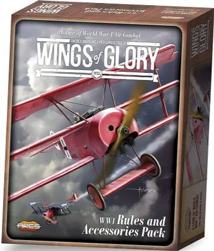The Wings of Glory: WW1 Rules and Accessories Pack is a complete game system that includes all the rules and accessories necessary to play the WW1 version of the game system. Players will find the core WW1 rules system presented in a beautiful forty-page color booklet with Basic, Standard, Advanced, and a wealth of Optional rules. Also included are all the rules and counters necessary to use special models (such as multi-engine bombers and balloons) and special weapons (anti-aircraft, rockets and incendiary bullets).